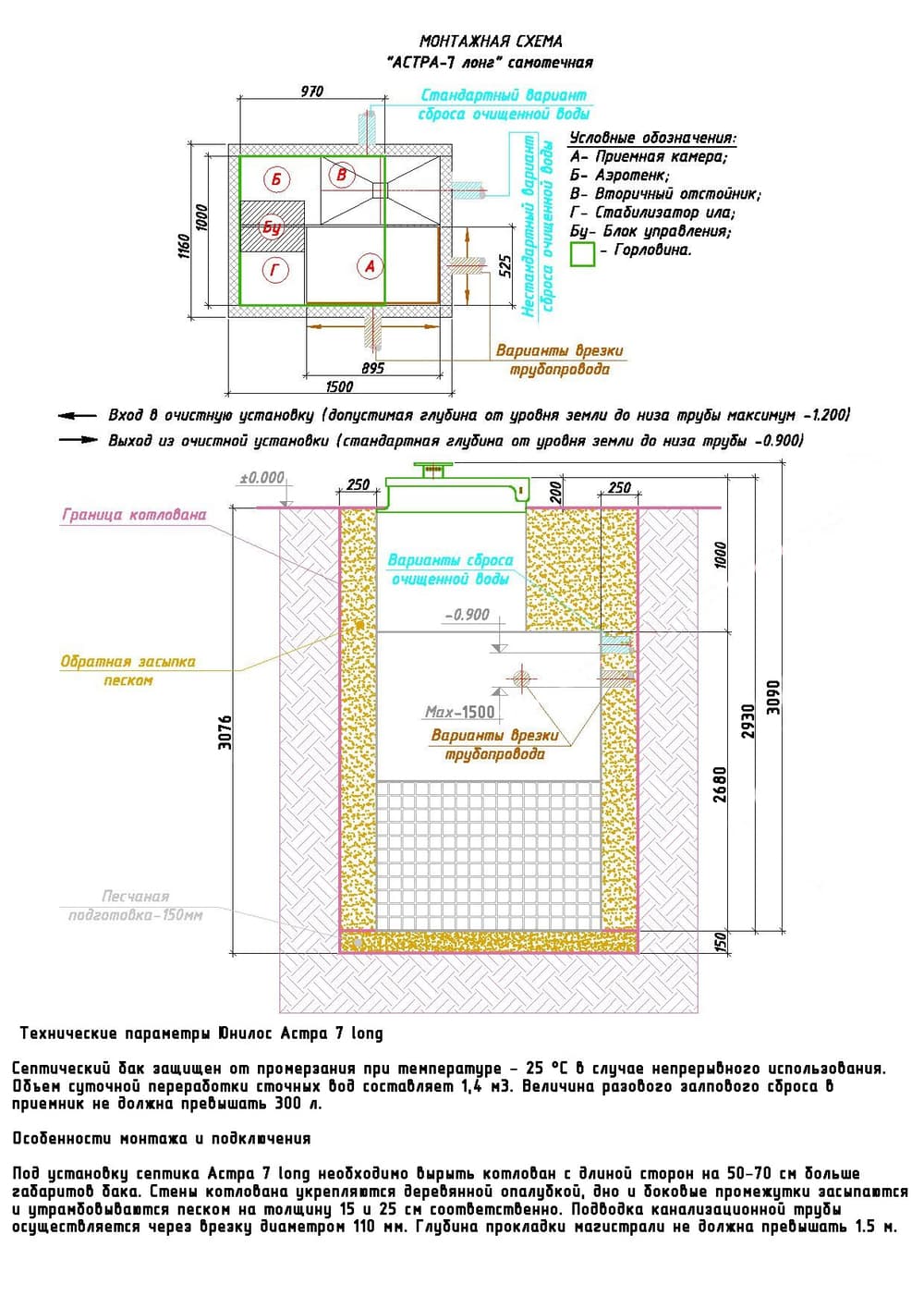 Канализации Юнилос Астра 7 отличаются по высоте и уровню врезки подводящей канализационной трубы в зависимости от глубины залегания выходящей трубы из дома и расстояния, на котором будет располагаться станция.