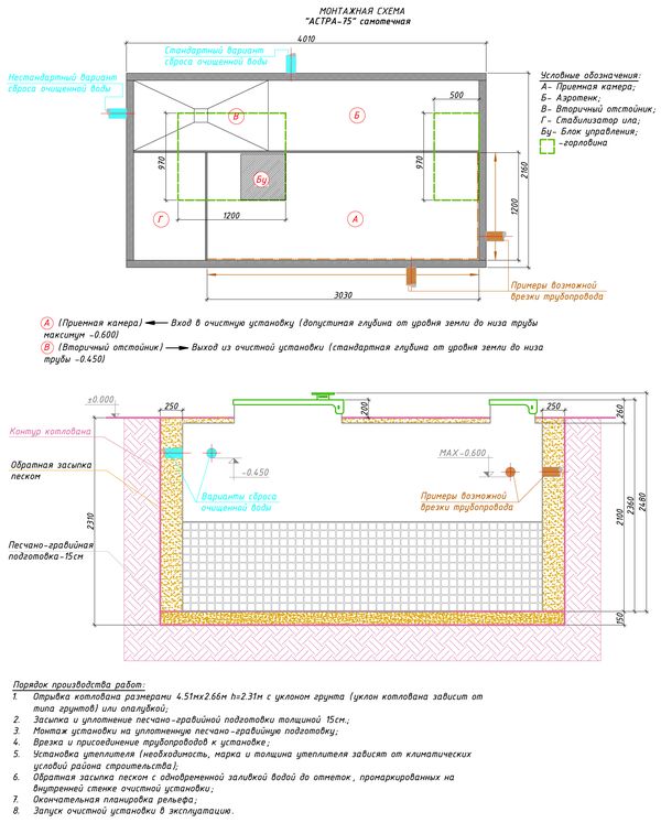Отведение очищенных сточных вод самотеком в фильтрующий колодец, в условиях песчаных или супесчаных грунтов. При организации системы канализации Астра 75 в глине и суглинке или в условиях высокого уровня грунтовых вод - самотечное отведение в фильтрующий колодец, в случае переполнения с отводом воды на рельеф (в пределах границ частного домовладения, а за их пределами по согласованию с органами санитарного надзора) принудительно с помощью насоса.